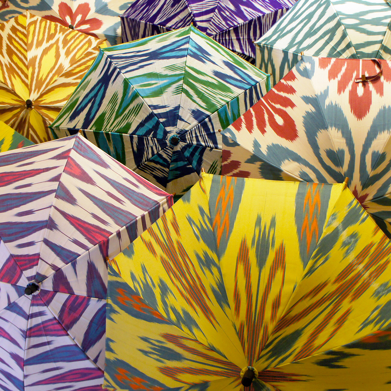 色とりどりのお花のように、中央アジアの伝統工芸染織りのIKAT(イカット)が傘になって咲き乱れています。日本の伝統工芸長傘職人が、イカットのカラフルな生地をモザイクのように張り上げた世界に一つ。日本*トルコ 手仕事の掛け算です
